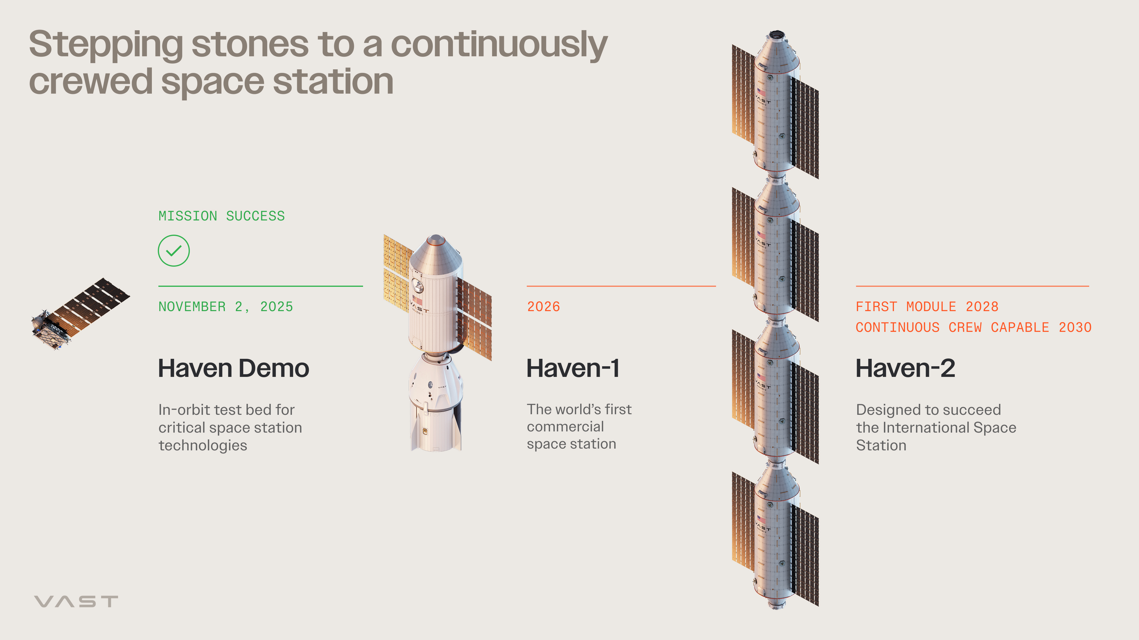 Vast is committed to delivering continuous human presence and earning the honor of being selected by NASA to build the successor to the ISS. Our strategy is simple: try, learn quickly, and improve by designing, building, testing, and flying Haven Demo, followed by Haven-1 and ultimately Haven-2 as our proposed replacement to the ISS. This is the fastest and most credible path to ensuring there is no gap in America's continuous human presence in space when the ISS retires in 2030.